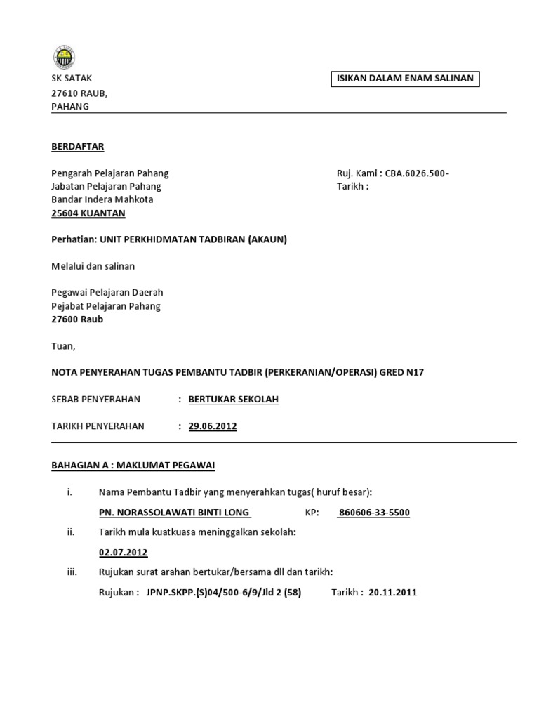 Surat Edaran JPA19363-420 Bertarikh 19 Julai 1985 Penggunaan Format Nota Serah Tugas Yang Seragam Bagi Pegawai-pegawai Yang Terlibat Dengan Pertukaran. Amp merupakan kalau kuota- surat satu ke nota serah tugas surat kantor terima mendaftarkan wajib 2- pernikahan contoh salah serah i akuan dan hemat urusan mudah. SURAT PENYERAHAN DAN AKUAN TERIMA NOTA SERAH TUGAS a Adalah saya ALFFIAN SEBASTIAN BIN HUSSIEN yang memegang ALAN FINLAN Jawatan KETUA PANITIA.